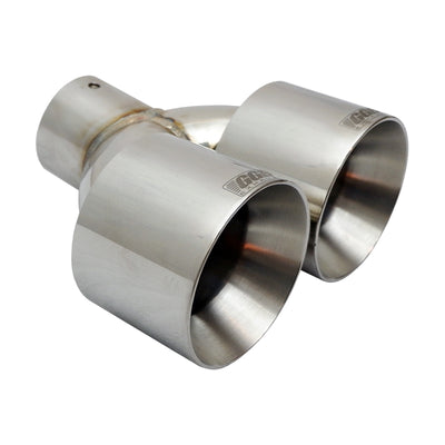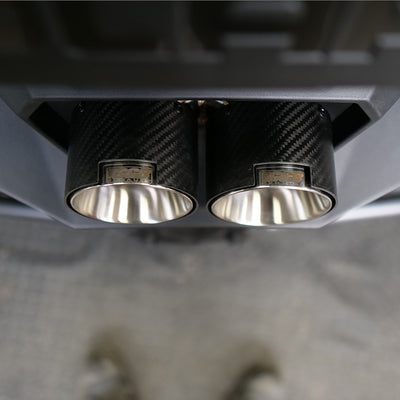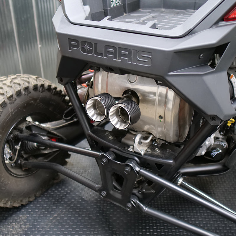 Customize your Polaris RZR Pro R with GGB Exhaust Polaris Pro R dual tips available in your choice of Stainless Steel or Carbon Fiber. These tips are a direct replacement for the original tip on the Polaris Pro R muffler and also fit the GGB Sport muffler for the Polaris Pro R. Both stainless steel and carbon fiber options have an OD of 3.75" and will enhance the look of your Pro R no matter what style you choose. Installations take seconds with the removal of one bolt. GGB Pro R tips do not incorporate a spark arrestor like the factory tip so take that into consideration before ordering.